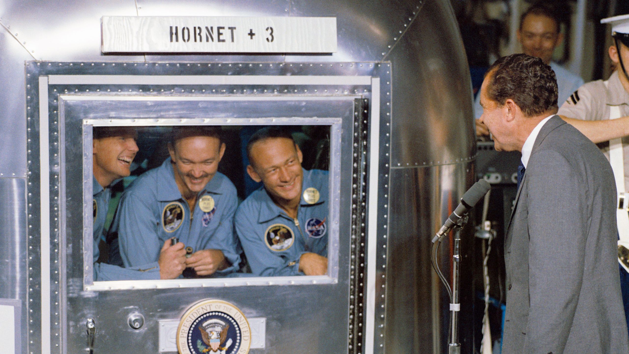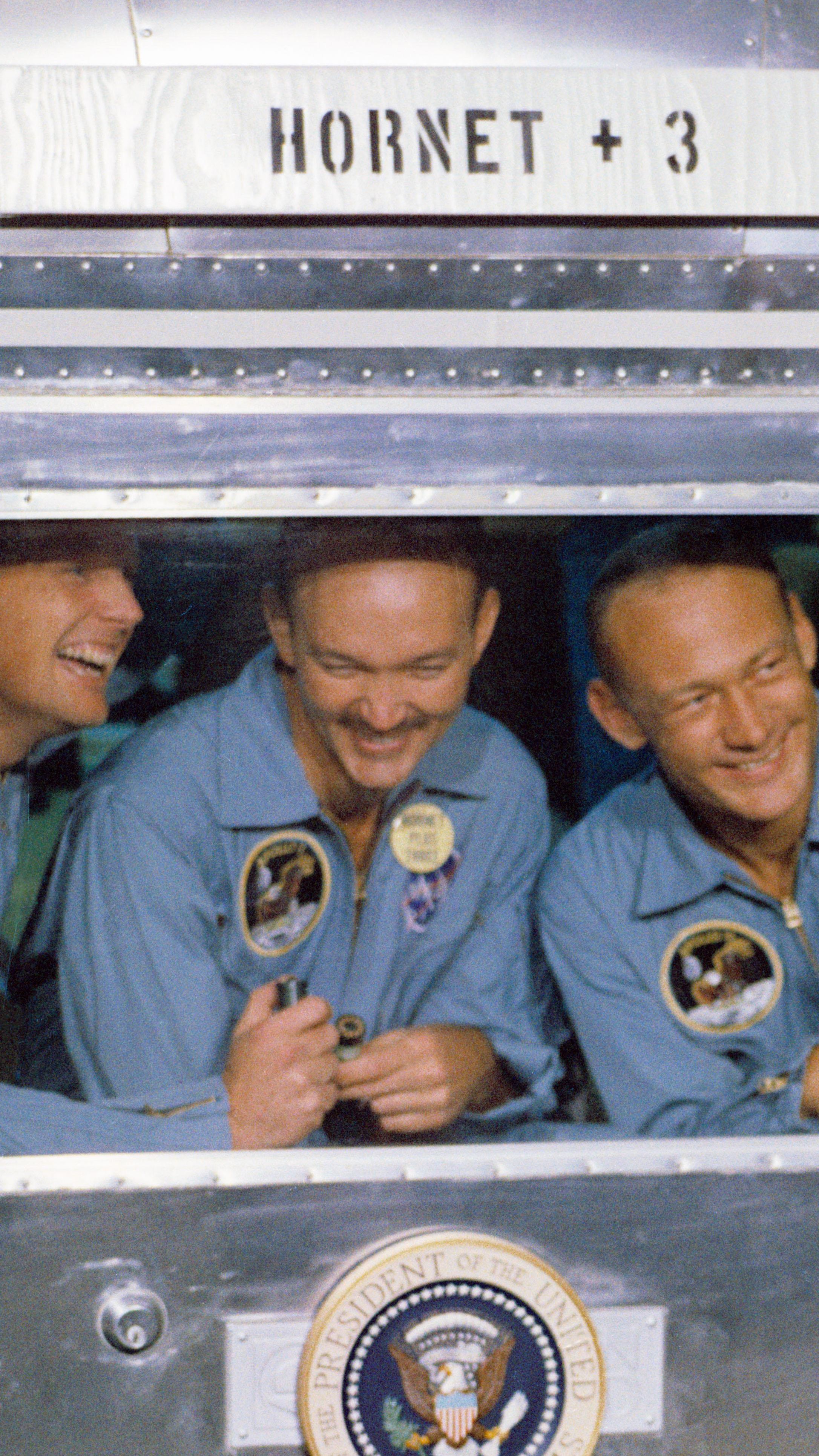 Just before dawn on the morning of 24 July, 1969, he was on board the USS Hornet, a Second World War-era aircraft carrier, as was President Nixon.
